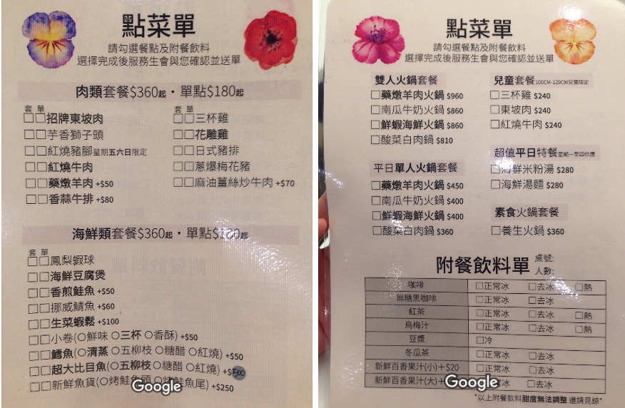 套餐大約都落在360元左右,假日的話有低消360、平日可以點特餐280