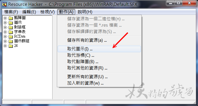 第5步 接著在按下「動作」→「取代點陣圖」來換掉壓縮包左側的圖片,這張圖片必須是bmp格式,預設的大小是92×302。一樣設計好後就可以將它替換。