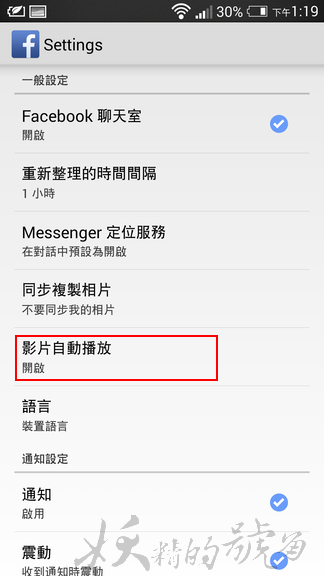 第2步 進入應用程式設定後,再點「影片自動撥放 – 開啟」這個地方。