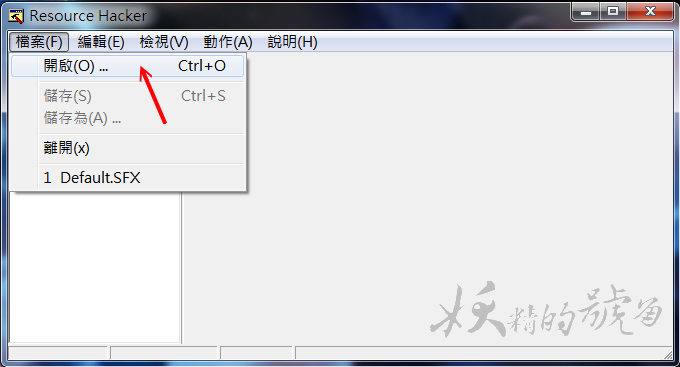 第1步 將上方的附件「ResHacker」解壓縮後執行,點選「檔案」→「開啟」。