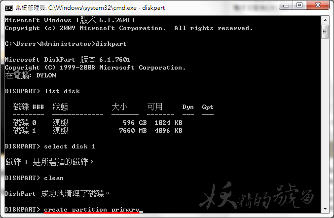 第3步 在這個畫面我們就能夠依照容量來判斷我們要處理的磁碟是哪一個,這邊只需要小心不要眼殘選成系統碟就可以了。如下圖,大小為7660 MB 的磁碟1很明顯的就是我們要的目標了,所以我們輸入『select disk 1』!