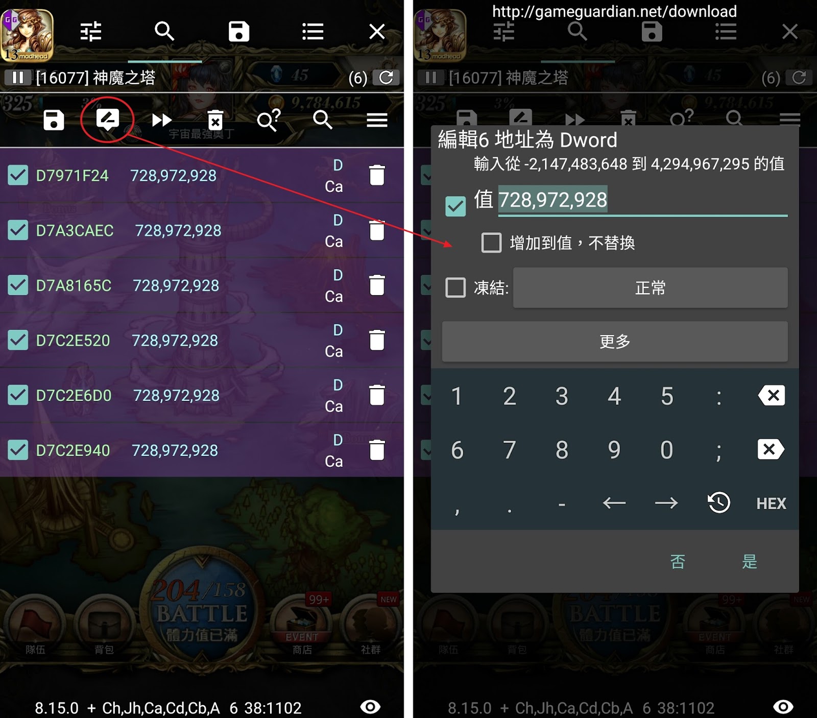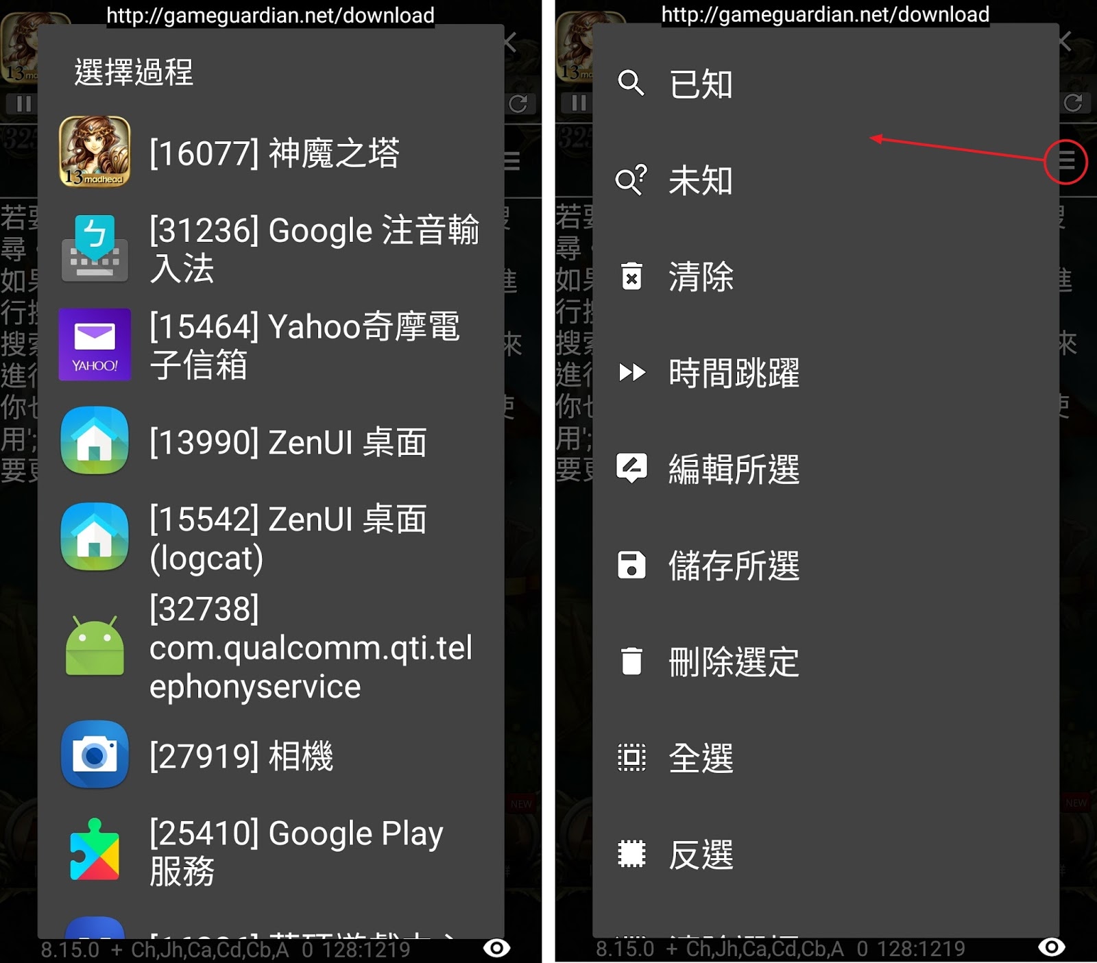 先開啟要修改的遊戲再打開GameGuardian,會跳出選擇進程的畫面,以「神魔之塔」為例,當然就是選擇神魔之塔囉。鎖定我們要修改的遊戲後,點右方紅圈處那個三條槓的圖示,就可以開始搜索了。依據數據的已知或未知來決定即可。