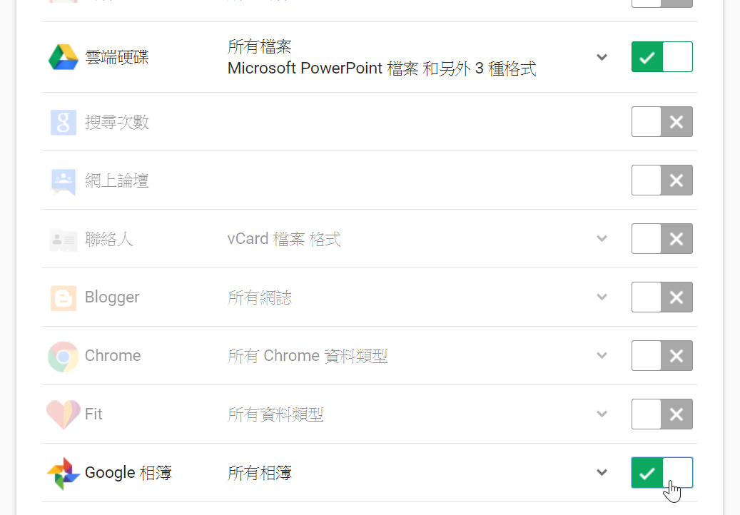 第2步 於是我們可以往下滑動,看到Google列出了許多自家的產品,預設是全部勾選的,不過我今天只是想要下載一份相片,因此只需要選擇相簿即可。當然,若您覺得雲端硬碟也需要整理整理了,不妨也把它勾上。